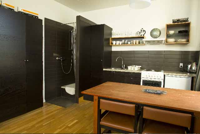 The apartment (first floor) is a beautifully renovated and furnished studio apartment with a fully equipped kitchen, TV, a large double bed with the possibility of adding a extra bed, dining area and bathroom, the shower however is in the dining area. Bedclothes and towels are provided.